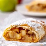 German Apple Strudel (Apfelstrudel) is a classic Austrian dessert featuring thinly stretched dough wrapped around a sweet mixture of sliced apples, raisins, cinnamon, and sugar, baked to golden perfection and dusted with powdered sugar.