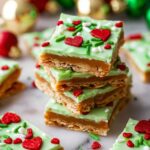 Grinch Christmas Crack is a festive and irresistible holiday treat featuring salty saltine crackers topped with a buttery brown sugar toffee, covered in vibrant green candy melts and colorful red and green sprinkles. Perfect for gifting or snacking during the holiday season.