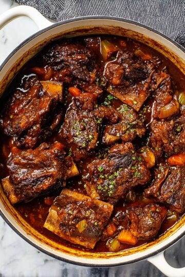 This Guinness Braised Short Ribs recipe features tender, fall-off-the-bone beef short ribs slowly cooked in a rich sauce made with Guinness stout, beef broth, tomato paste, and aromatic herbs. Perfectly seared and braised to develop deep flavors, this dish is ideal served over creamy mashed potatoes, pasta, or polenta for a comforting and hearty meal.