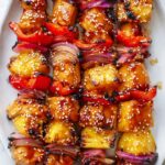 Easy and delicious Hawaiian Teriyaki Chicken Kabobs featuring juicy chicken thigh pieces marinated in a homemade teriyaki sauce, paired with fresh pineapple, red bell pepper, and red onion. Perfect for baking or grilling, these kabobs are glazed with a flavorful teriyaki sauce and garnished with sesame seeds for a tropical twist.
