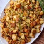 I recommend using sturdy bread like sourdough, Italian, or a rustic country loaf. Stale or toasted bread is ideal because it absorbs the butter and broth without getting mushy. Avoid bread that’s too soft or fresh, as it can make the stuffing soggy.