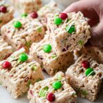 Festive and easy-to-make Holiday Rice Krispie Treats featuring buttery marshmallow cereal bars with holiday M&M's, sprinkles, and a white chocolate drizzle, perfect for seasonal celebrations.