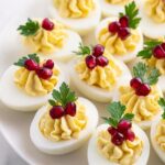 - Garnish: Top each deviled egg with one parsley stem and 2 to 3 pomegranate seeds for a festive holiday look.