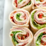 Italian Pinwheels are a delicious and easy-to-make appetizer featuring a flavorful pepper spread, layers of salami, pepperoni, provolone cheese, and romaine lettuce rolled into large flour tortillas and chilled before serving. Perfect for parties or snack time!