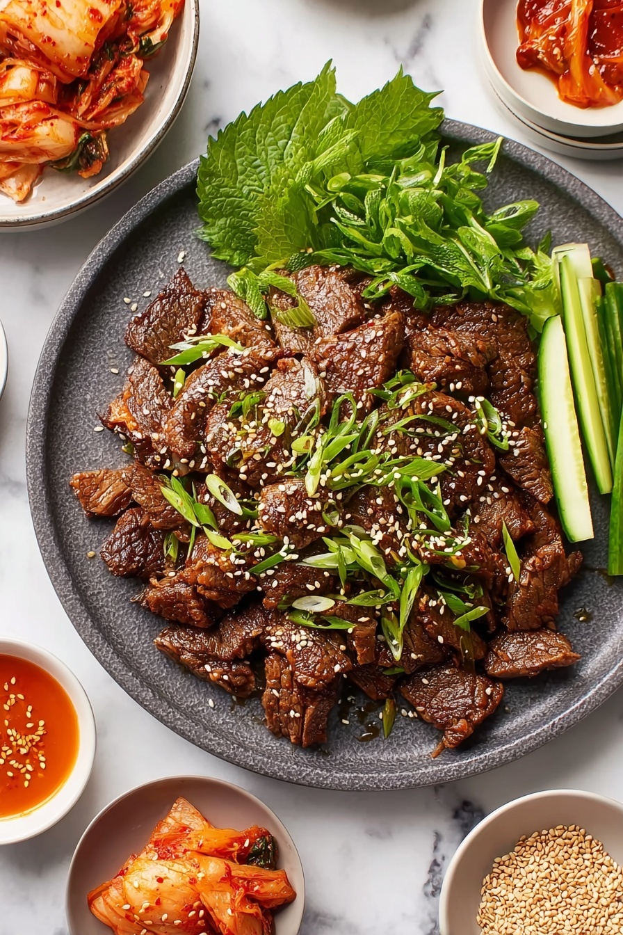 Transfer your cooked beef to plates and sprinkle generously with thinly sliced green onions and toasted sesame seeds. Serve hot to enjoy that fresh, tender texture and rich, savory-sweet flavor. This dish pairs beautifully with steamed rice, a side of kimchi, or wrapped in crisp lettuce leaves for a hands-on feast.