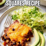 Loaded Taco Squares Casserole is a hearty and flavorful dish featuring layers of seasoned ground beef, bell pepper, onion, garlic, and classic taco spices combined with black beans, sweet corn, hatch chiles, diced tomatoes, and corn tortillas, all topped with melted cheddar cheese. This comforting casserole bakes to perfection with a golden cheese crust, ideal for family meals or gatherings.