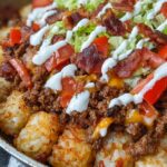 Loaded Tater Tot Nacho Casserole is a comforting and indulgent dish featuring crispy baked tater tots layered with seasoned ground beef, sautéed peppers and onions, crispy bacon, and melted cheddar and mozzarella cheeses. This hearty casserole is perfect for a crowd or family dinner, topped with sour cream or Greek yogurt and hot sauce for added flavor.