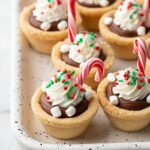These Peanut Butter Cup Hot Chocolate Cookie Cups are a festive and fun holiday treat combining soft sugar cookie dough baked into mini cups, filled with miniature Reese's peanut butter cups, and decorated with white icing, marshmallow bits, holiday sprinkles, and peppermint candy cane handles.