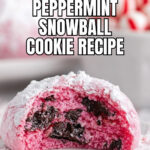 Christmas Peppermint Snowball Sugar Cookies are festive, buttery cookies infused with peppermint and vanilla, studded with mini chocolate chips, and coated in powdered sugar and crushed peppermint candies for a snowy, minty treat perfect for the holiday season.