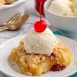 - Cool Slightly and Serve: Remove the cake from the oven and let it cool slightly for about 10-15 minutes. Serve warm, topped with a scoop of vanilla ice cream and a maraschino cherry if desired.