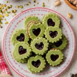 Delicious Pistachio Linzer Cookies with a tender crumbly texture and vibrant green hue, sandwiched with sweet raspberry jam. Perfect for festive occasions or a delightful treat any time.