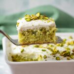 - Frost the Cake: Once the cake is completely cooled, spread the pistachio pudding frosting evenly over the top. Garnish with chopped pistachios if desired.
