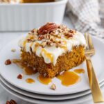 I usually serve this Pumpkin Poke Cake Recipe chilled, but if you want it a little warmer, I let slices sit at room temp for 15 minutes. Avoid microwaving as it can melt the frosting and caramel unevenly.
