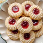 Delicious raspberry almond thumbprint cookies featuring a tender buttery shortbread base, filled with sweet raspberry jam and finished with a smooth glaze icing. Perfectly chilled and baked to light golden perfection for a delightful treat.