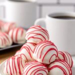 Delightfully sweet and creamy Red Velvet Cheesecake Bites combine the rich flavors of red velvet cake mix and smooth cream cheese, coated in a luscious white almond bark and finished with optional red candy melt stripes. Perfect bite-sized treats for parties or dessert.