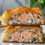 This Spinach Feta Salmon in Phyllo recipe features succulent salmon fillets wrapped in crispy, buttery phyllo dough filled with a creamy spinach, feta, and shallot mixture. Perfectly seasoned and baked to golden perfection, it's a delightful main course that combines flaky fish with Mediterranean flavors and a satisfying crunch.