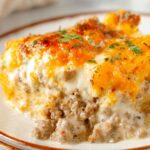 This Biscuits and Gravy Breakfast Casserole combines savory sausage gravy with fluffy biscuits and a cheesy egg mixture, baked to golden perfection for a hearty and comforting breakfast or brunch dish.
