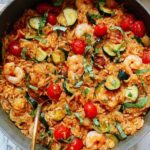 A flavorful and easy one-pan Shrimp and Rice Skillet featuring sautéed zucchini, garlic, savory Italian seasoning, and juicy cherry tomatoes cooked to perfection with tender shrimp and fluffy white rice.