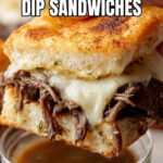 Slow Cooker French Dip Sandwiches feature tender, juicy beef chuck roast cooked low and slow with onion soup mix and beef broth, served on crusty rolls with melted Swiss or provolone cheese. This hearty American main course is perfect for an easy, comforting meal with flavorful au jus for dipping.