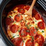 Slow Cooker Pizza Chicken is a delicious and easy-to-make recipe featuring tender chicken breasts stuffed with a cheesy Italian seasoning mixture, topped with marinara sauce, mozzarella, and pepperoni. Cooked slowly to perfection, it's perfect served over pasta for a hearty main course.