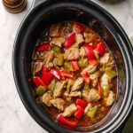 Slow Cooker Salt & Pepper Sticky Chicken is a flavorful and easy-to-make dish featuring tender chicken breast chunks cooked in a savory mix of ginger, tomato ketchup, soy sauce, Chinese five spice, chili flakes, and crushed black peppercorns. The slow cooking process infuses the meat with rich flavors and a sticky glaze, enhanced by crunchy red peppers and spring onions added at the end for freshness. Perfect served with rice or noodles for a comforting meal.
