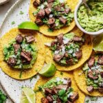 - Assemble the tacos: Warm tortillas and place a generous spoonful or two of carne asada on each. Top with diced onions, chopped cilantro, crumbled cotija cheese, and a spritz of fresh lime juice.