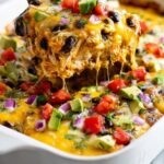 - Garnish and Serve. Garnish with additional cilantro and any desired toppings like diced tomatoes, avocados, jalapenos, and red onions. Serve with sour cream and tortilla chips to scoop up the casserole.