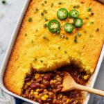 - Feel free to add shredded cheese on top of the cornbread during the last 10 minutes of baking or layer it over the chili before adding the cornbread topping for extra richness.
