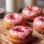 These Strawberry Glazed Donuts feature a soft, fluffy donut dough enhanced with freeze-dried strawberry powder for a lovely pink hue and fruity flavor. The donuts are fried to golden perfection, then coated in strawberry sugar and finished with a sweet, vibrant strawberry glaze topped with freeze-dried strawberry pieces. Perfect for breakfast, brunch, or dessert, these donuts bring a delightful homemade touch with an irresistible strawberry twist.