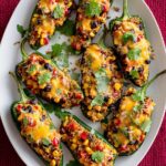 - Stuff peppers: Spoon the filling mixture into each poblano pepper half, filling them heaping full. Press down slightly if needed to fit more filling inside.