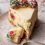 This Sugar Cookie Cheesecake combines a buttery sugar cookie crust with festive cookie dough balls baked right into a creamy, smooth cheesecake. Topped with a luscious white chocolate ganache and sprinkled with colorful Christmas jimmies, this dessert is perfect for holiday celebrations and satisfying sweet cravings.