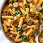 A rich and flavorful sun-dried tomato pasta featuring sweet Italian sausage, a creamy tomato sauce with sun-dried tomatoes and spinach, paired perfectly with your favorite pasta for a satisfying and comforting meal.