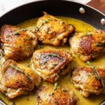 This recipe for Baked Chicken Thighs features juicy, bone-in, skin-on chicken thighs seared to golden perfection and finished in the oven with a flavorful pan sauce made from white wine, garlic, chicken broth, and fresh herbs. Optional homemade gravy can be prepared from the pan drippings for an extra touch of comfort and richness. Simple techniques combined with fresh ingredients make this a delicious and classic main course perfect for weeknight dinners or special occasions.