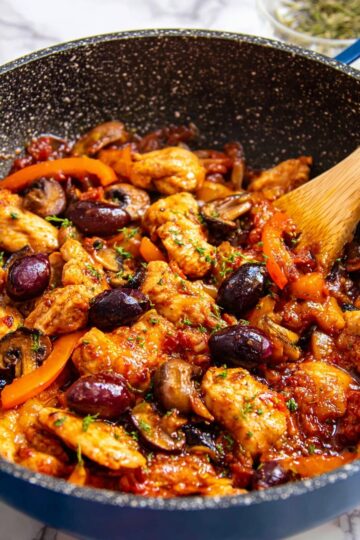 A classic Italian chicken dish featuring tender chicken wings and drumsticks simmered in a rich tomato sauce with bell peppers, mushrooms, Kalamata olives, and a splash of red wine, perfect served over noodles, rice, or polenta.