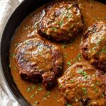 This Steak with Gravy recipe features juicy top sirloin, strip steak, or ribeye seared to perfection and simmered in a flavorful homemade gravy made with dry white wine, beef broth, and aromatic seasonings. The rich, buttery gravy enhances the tender steak, making it an ideal main course to serve with mashed potatoes and roasted green beans for a comforting, restaurant-quality dinner at home.