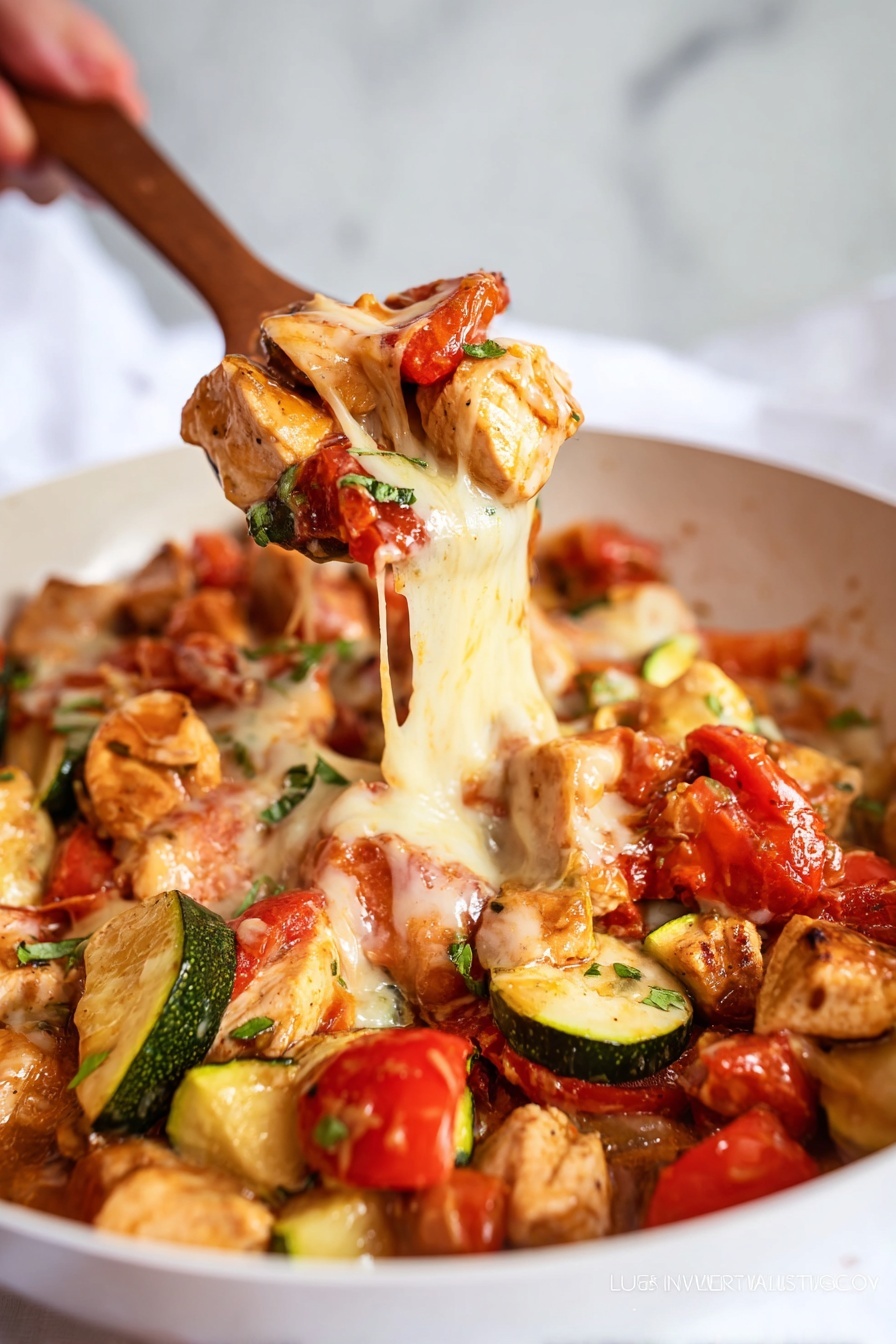 Carefully distribute the mozzarella balls evenly on top of the chicken and vegetables. Then cover the pan with a lid and let it cook for a few minutes—just enough for the mozzarella to melt into gooey, cheesy pockets that make every bite extra comforting.