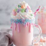I always go for a big fluffy cloud of whipped cream topped with mini marshmallows and a generous sprinkle of rainbow or pastel sprinkles that match the pink theme. Sometimes, I drizzle extra melted candy melts over the top for a glossy, colorful finish. It’s about turning this drink into a treat for all your senses.