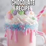 Unicorn Hot Chocolate is a whimsical and colorful twist on traditional hot chocolate, featuring creamy milk and white hot chocolate mix infused with pink food coloring, topped with whipped cream, mini marshmallows, sprinkles, and optional melted candy melts for a magical treat perfect for any occasion.