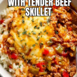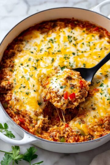 This easy Unstuffed Peppers recipe is made in a single skillet with ground beef, sausage, rice, and melted cheese. Loaded with flavorful seasonings, diced tomatoes, and marinara sauce, it’s a comforting and family-friendly meal perfect for busy weeknights. Finished with bubbling cheese and fresh parsley, this hearty dish brings all the classic stuffed pepper flavors without the hassle of hollowing out the peppers.