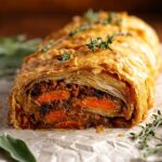 A delicious and hearty Mushroom Wellington featuring a savory mushroom and sweet potato filling wrapped in flaky puff pastry. Perfect as a vegetarian main dish, it combines caramelized onions, aromatic herbs, and baby spinach for a flavorful, comforting meal.